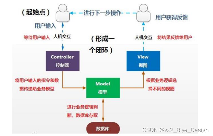 页面发送请求给控制器,控制器调用业务层处理逻辑,逻辑层向持久层发送请求,持久层与数据库交互,后将结果返回给业务层,业务层将处理逻辑发送给控制器,控制器再调用视图展现数据。