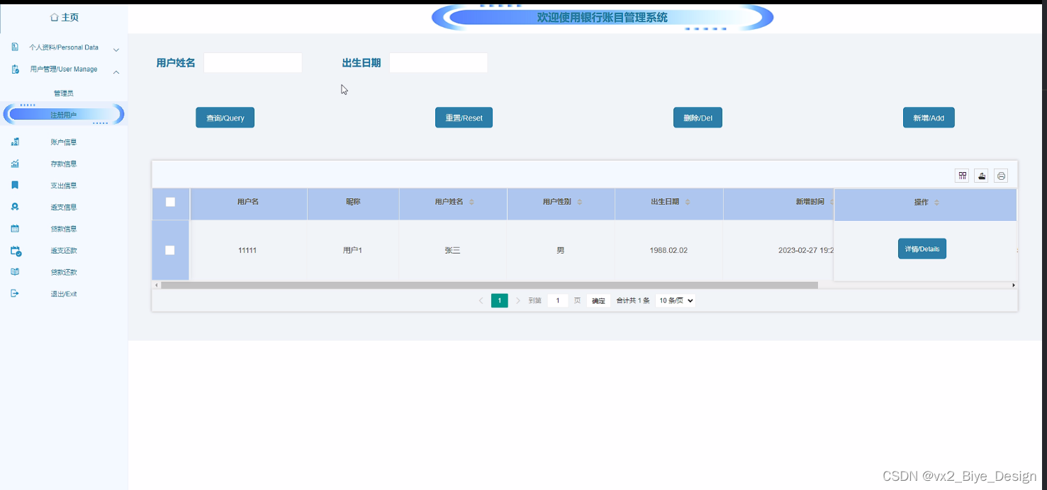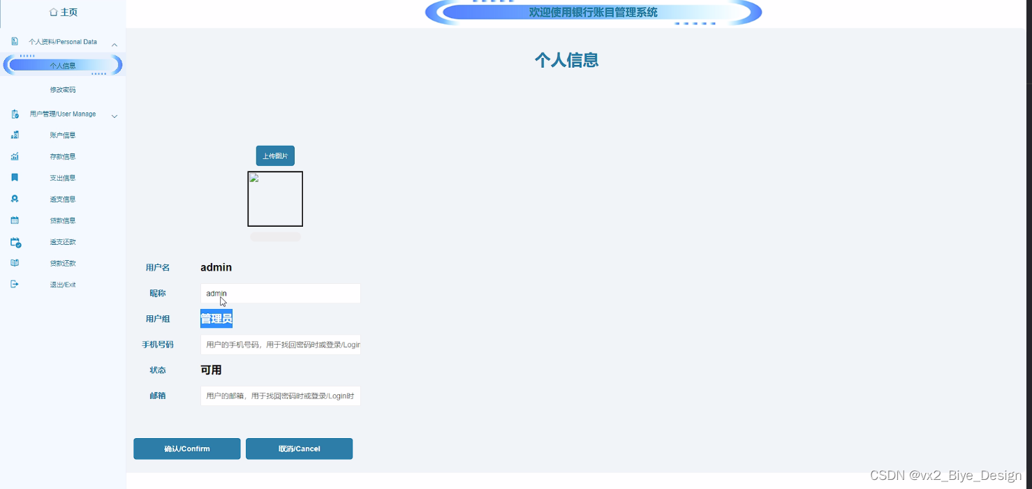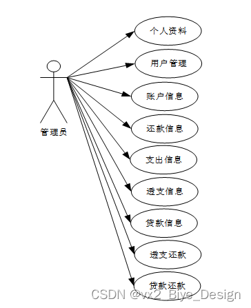 管理员模块:主页、个人资料、用户管理(管理员、注册用户)账户信息、存款信息、支出信息、透支信息、贷款信息、透支还款、贷款还款。