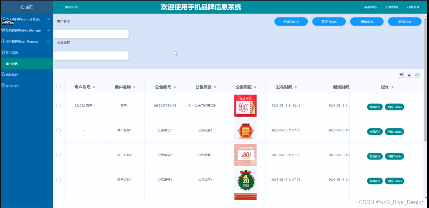 管理员点击“商户公告”会显示出所有的商户公告信息,支持输入商户名称或者公告标题对商户公告信息进行查询,如果想要添加新的商户公告信息,点击“添加”按钮,输入商户名称、公告标题、商户账号、公告编号、公告海报、发布时间 等信息,点击“提交”按钮就可以添加了,同时可以选择某一条商户公告信息,点击“删除”进行删除,也可以对用户提交的商户公告评论的信息进行管控。界面如下图4-12所示。