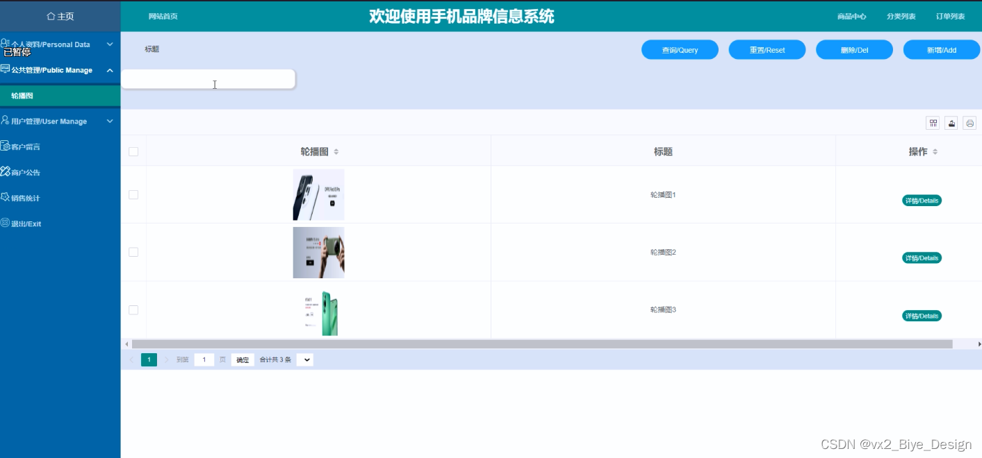 (3)公共管理:管理员点击“公共管理”菜单可以对首页展示的轮播图进行增删改查。