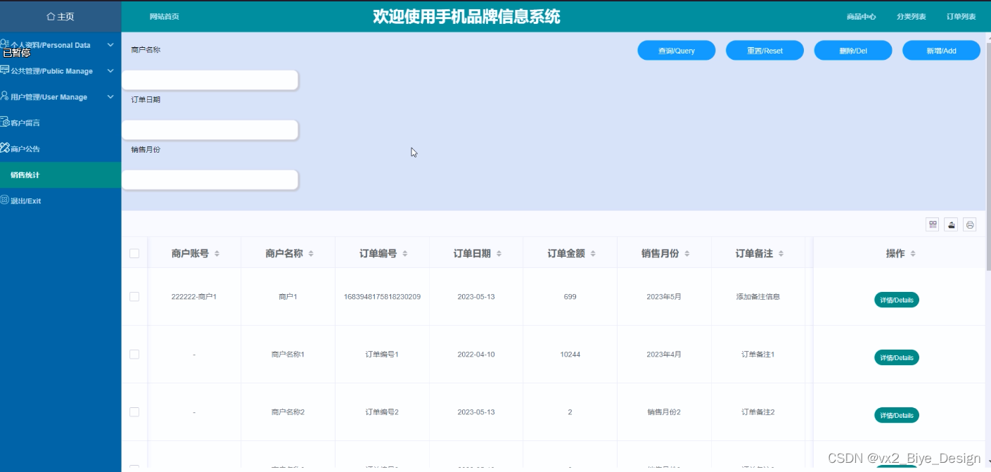 管理员点击“销售统计”会显示出所有的销售统计信息,支持通过商户名称或者订单日期或者销售月份对销售统计信息进行查询,如果想要添加新的销售统计信息,点击“添加”按钮,输入相关信息,点击“提交”按钮就可以添加了,同时可以选择某一条销售统计信息,点击“删除”进行删除。界面如下图4-13所示。