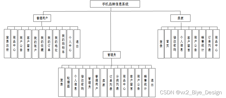 按照手机品牌信息系统的角色,我划分为了普通用户管理模块、卖家管理模块和管理员管理模块这三大部分。