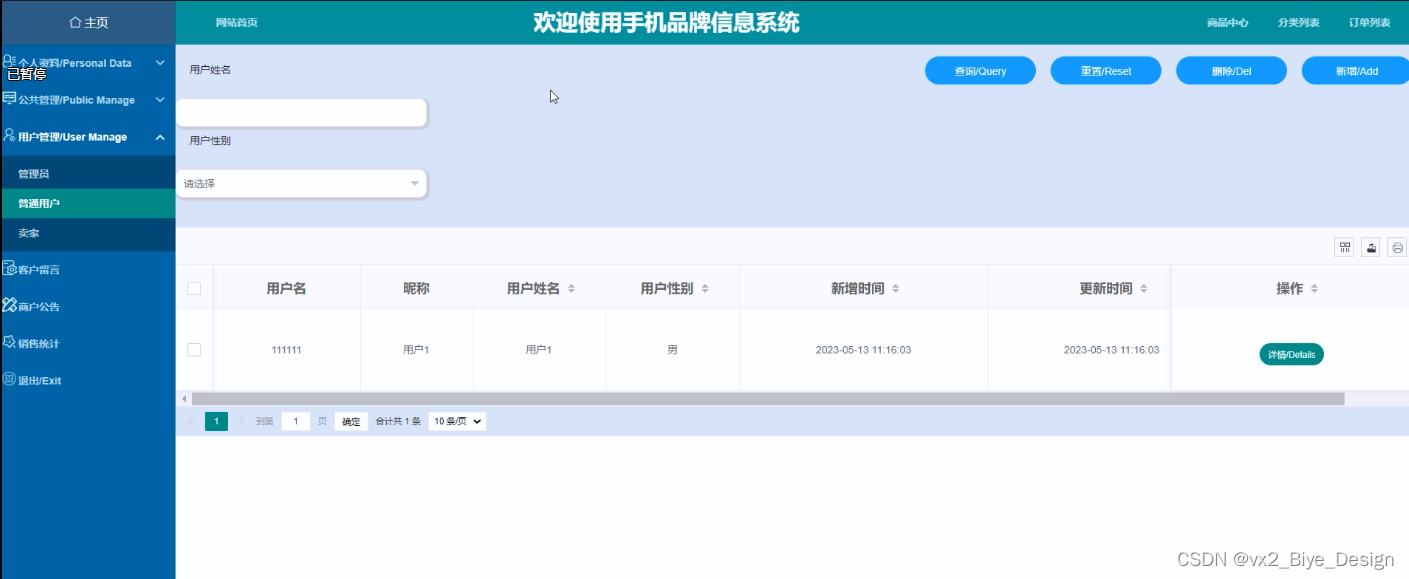 (4)用户管理:管理员点击“用户管理”这一菜单会显示管理员、卖家和普通用户这三个子菜单,管理员可以对这三个角色的信息进行增删改查操作;