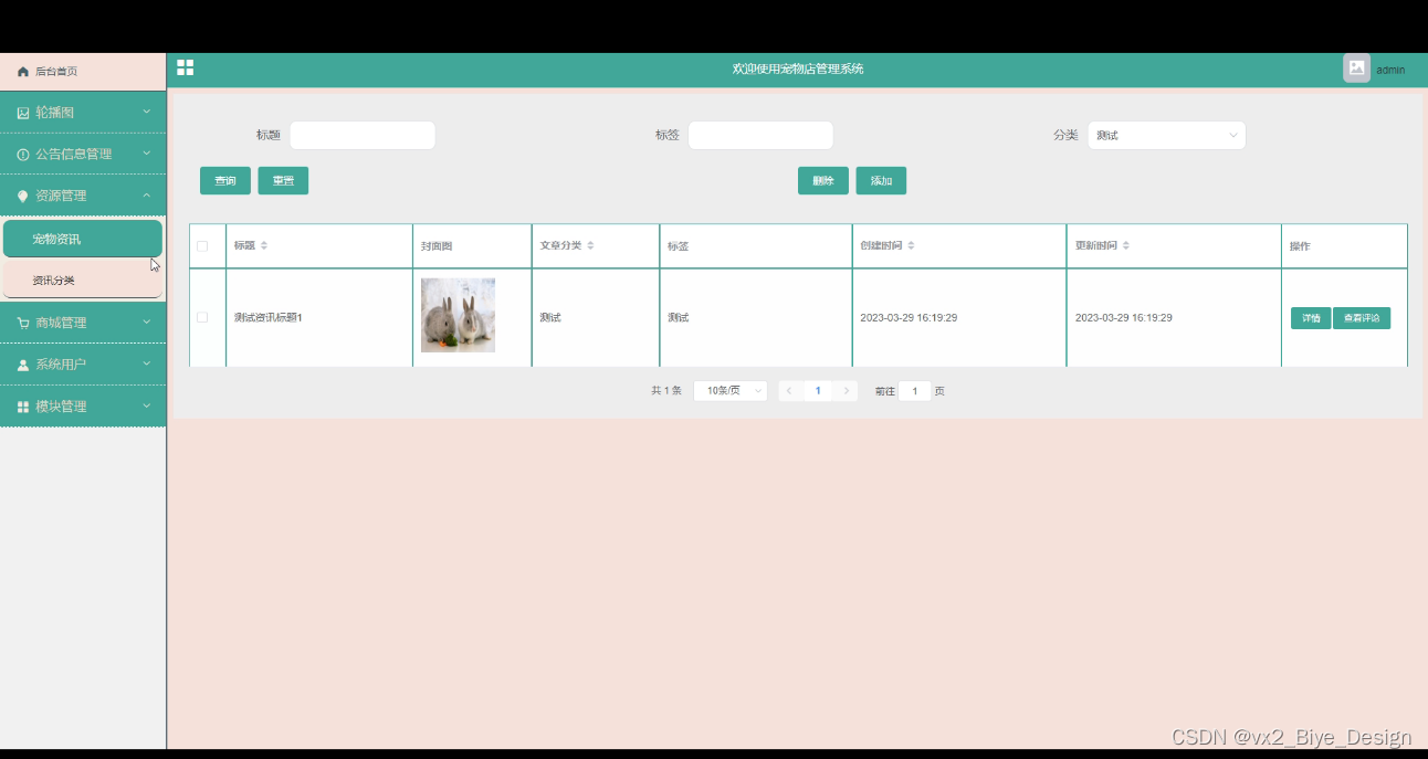 宠物资讯,在此界面可查看宠物资讯的标题,封面,文章分类,标签等信息,还可在此页面对进行重置,删除,添加等操作,如图5-5所示: