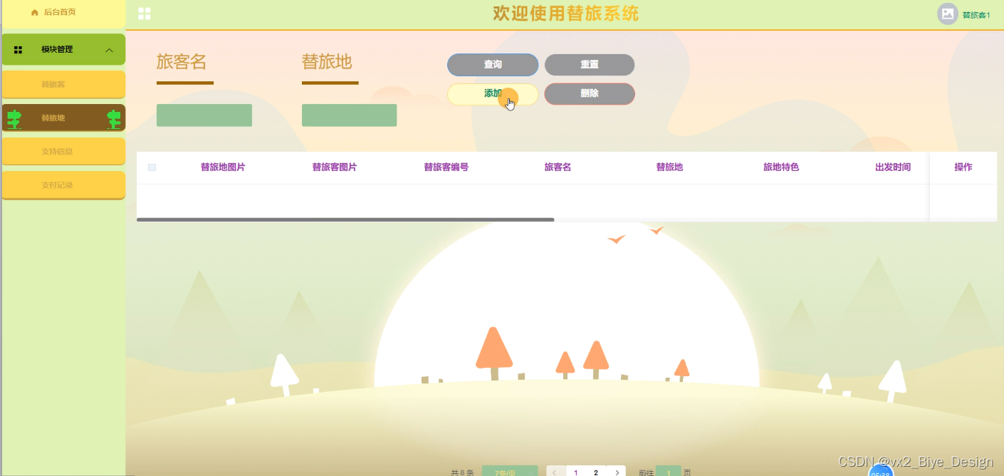 替旅地管理,在替旅地管理页面可以查看替旅地图片、替旅客图片、替旅客编号、旅客名、替旅地、旅地特点、出发时间等内容,并可根据需要进行添加、修改或删除操作,如图5-14所示。