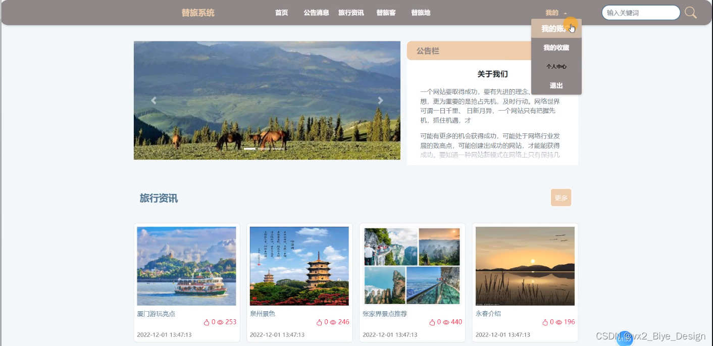 With the development of society, all walks of life in society are taking advantage of the advantages of the information age. The advantages and popularity of computers make the development of various information systems necessary. The main modules of the alternate travel system design include functions such as viewing the background homepage, rotating map (rotating map management), announcement management (bulletin board), resource management (travel information, information classification), system users (administrators, alternate travel users, system users), and module management (alternate travel, alternate travel, support information, and payment records). The main purpose of administrators in the system is to store and manage various types of information safely and effectively. They can also manage, update, and maintain the system, and have corresponding operation permissions for the background.
