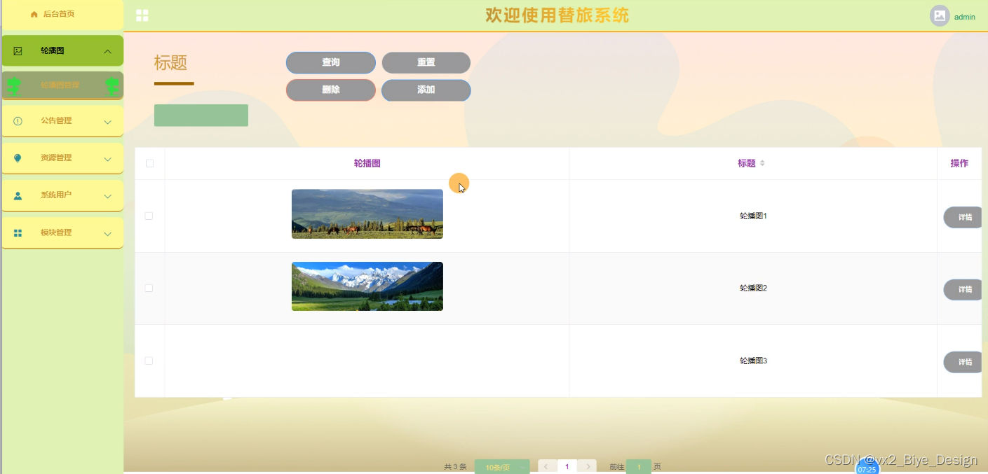 轮播图管理,管理员通过输入标题、轮播图等内容,根据详情进行添加、查询、删除等操作提交,如图5-8所示。
