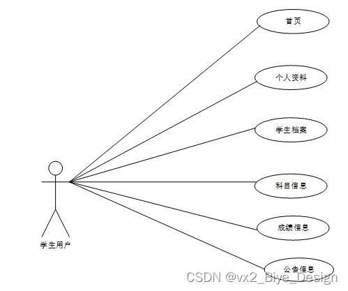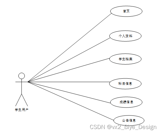 学生注册登录后可进行首页、个人资料(个人信息、修改密码)、学生档案、科目信息、成绩信息、公告信息,学生用例如图3-2所示。