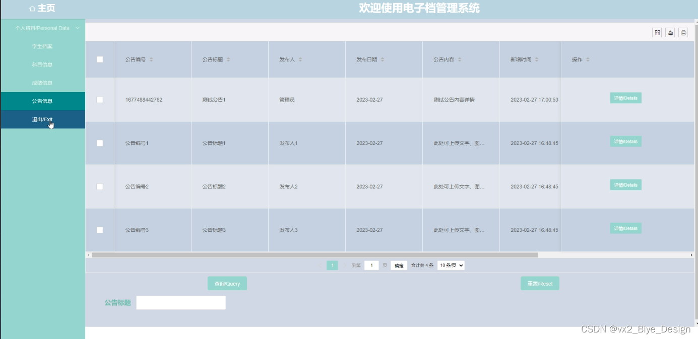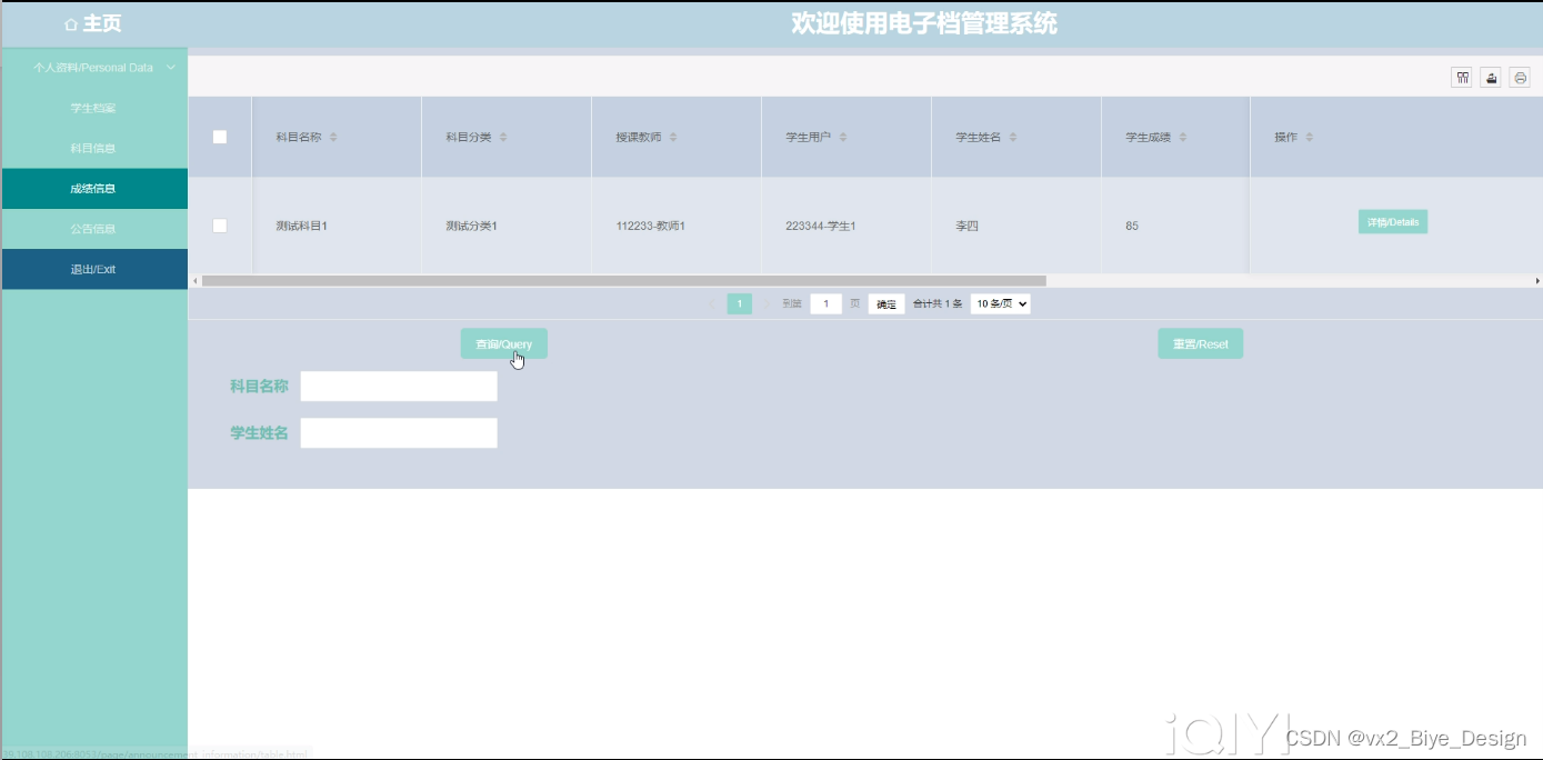 学生可以实现:首页、个人资料(个人信息、修改密码)、学生档案、科目信息、成绩信息、公告信息等。