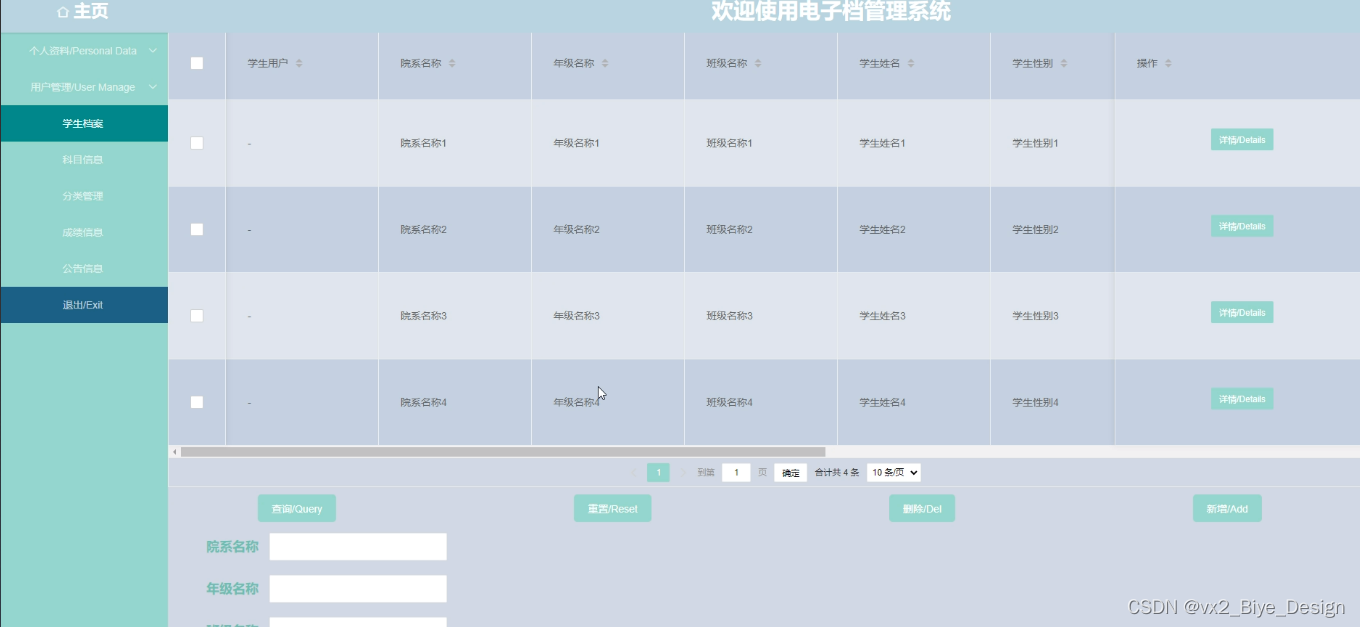 学生档案管理,管理员在学生档案页面可以查看学生用户、年级名称、学生姓名、学生学号、档案备注、院系名称、班级名称、学生性别、入学年份等内容,并根据需要进行新增、修改、删除等操作,如图5-5所示。