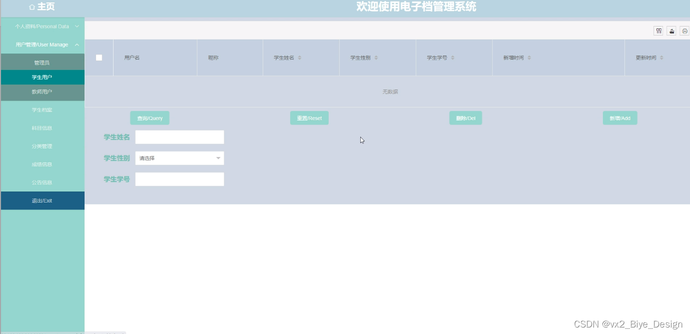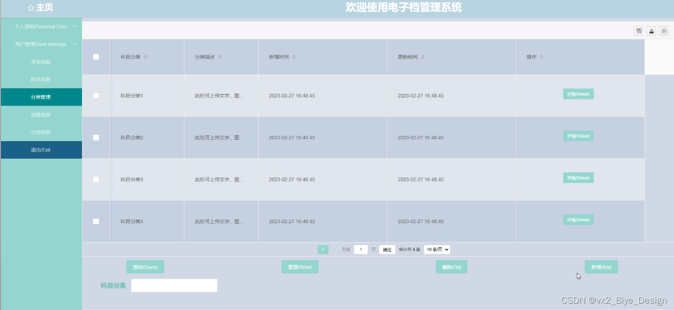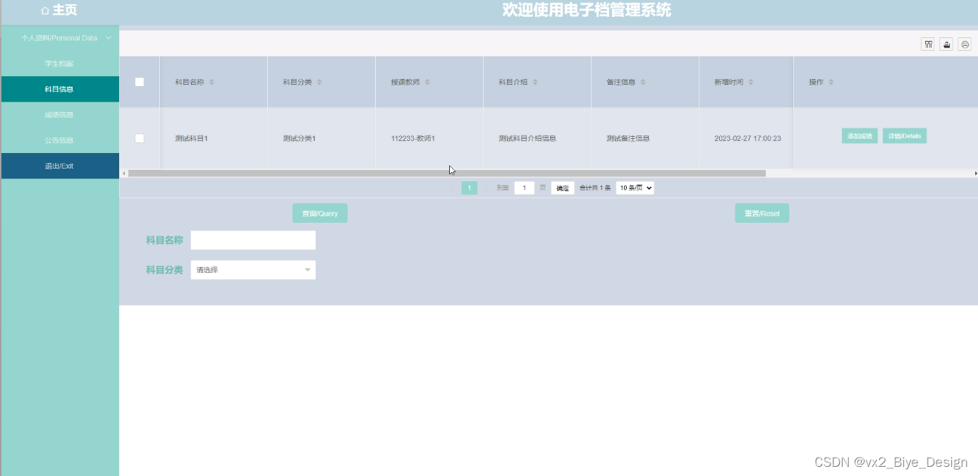 系统管理也都将通过计算机进行整体智能化操作,对于电子档管理系统所牵扯的管理及数据保存都是非常多的,例如首页、个人资料(个人信息、修改密码)、用户管理(管理员、学生用户、教师用户)、学生档案、科目信息、分类管理、成绩信息、公告信息等功能,都是通过笔记的方式进行详细信息的统计,后来出现电脑,通过电脑输入软件将纸质的信息统计到电脑上,这种方式比较传统,而且想要统计数据信息比较麻烦,还受时间和空间的影响,所以为此开发了电子档管理系统;为用户提供了方便管理平台,方便管理员查看及维护,并且可以通过需求进行设备信息内容的编辑及维护等;对于用户而言,可以随时进行查看出勤和成绩信息,管理员可以足不出户就可以获取到系统的数据信息等,而且还能节省用户很多时间,所以开发电子档管理系统给管理者带来了很大的方便,同时也方便管理员对用户信息进行处理。