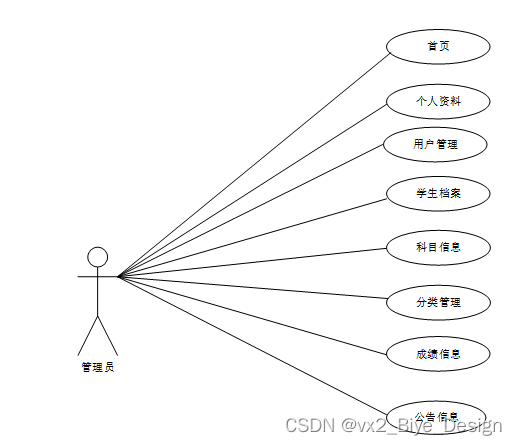 管理员登录后可进行系统首页、个人资料(个人信息、修改密码)、用户管理(管理员、学生用户、教师用户)、学生档案、科目信息、分类管理、成绩信息、公告信息管理,管理员用户的用例如图3-1所示。