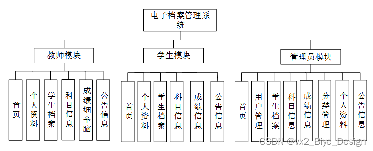 使用电子档管理系统系统的用户分管理员和学生用户及教师用户三个角色的权限子模块。