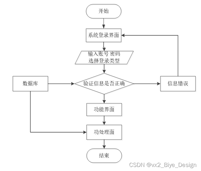 用户想进入系统,首先进入系统登录界面,通过正确的用户名、密码,选择登录类型登录,系统会检查登录信息,信息正确,然后输入相应的功能界面,提示信息错误,登录失败。系统操作流程如图3-3所示。