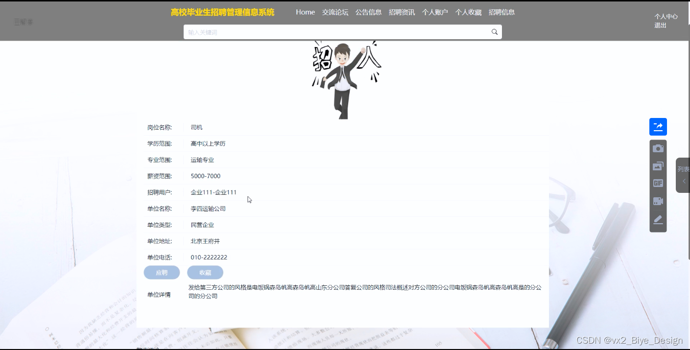 The college graduates recruitment management information system takes MySQL as the main storage unit of the background data, uses software engineering principles and development methods, and uses the Java technology of spring boot to build a management system, which realizes all the functions of the system. Complete the page design and function realization of the main modules of the system. This article shows the implementation effect of the home page, and introduces the implementation process of student user, unit type, recruitment information, application information, interview interview_notice, employment information, student resume, employment evaluation, enterprise invitation and other functions through the code and page.