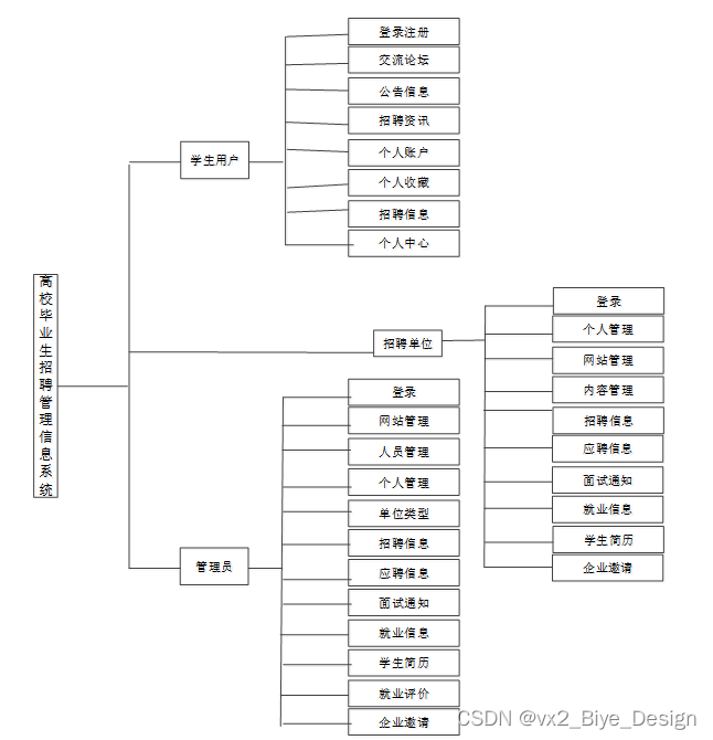 高校毕业生招聘管理信息系统从角色上划分为了学生用户、招聘单位、管理员三种角色。
