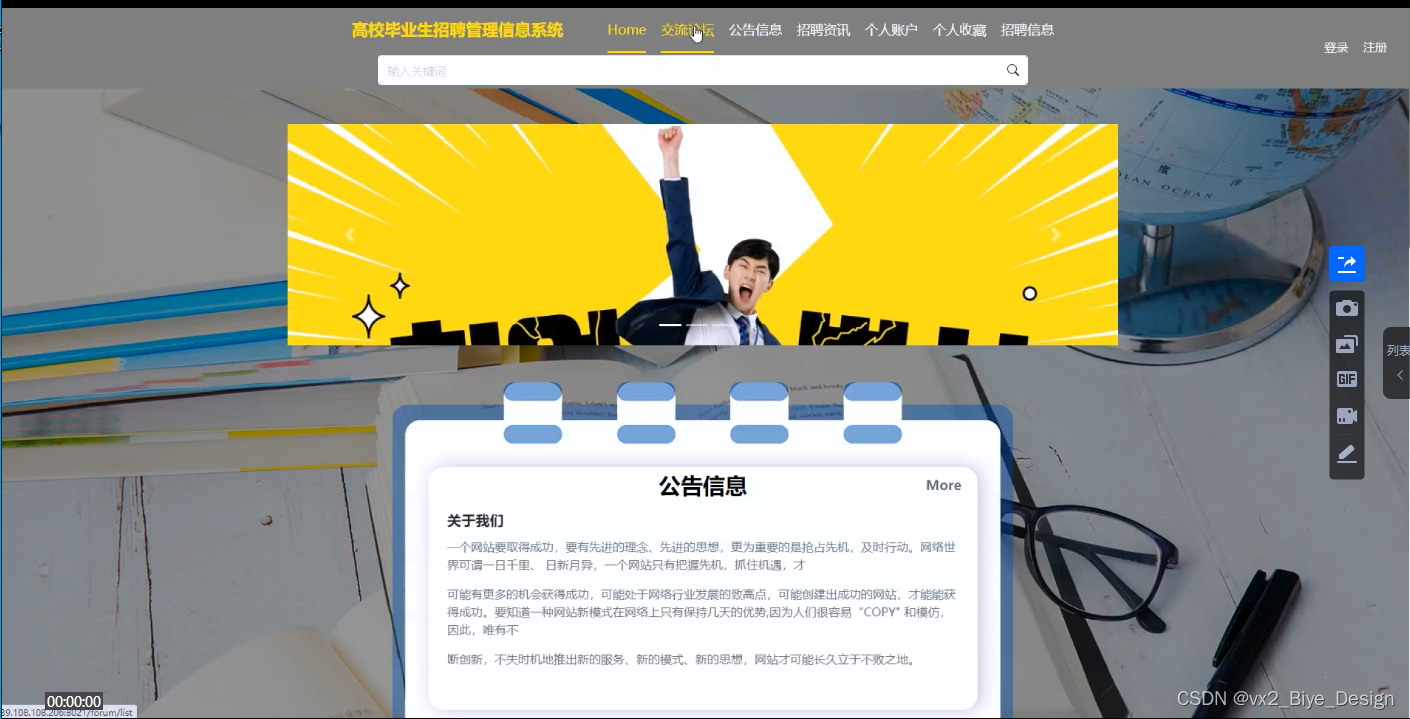 (2)招聘资讯:在首页导航栏上我们会看到“招聘资讯”这一菜单,我们点击进入进去以后,会看到所有资讯列表,在这个界面,我们可以点击进入进行查看、评论、点赞等;