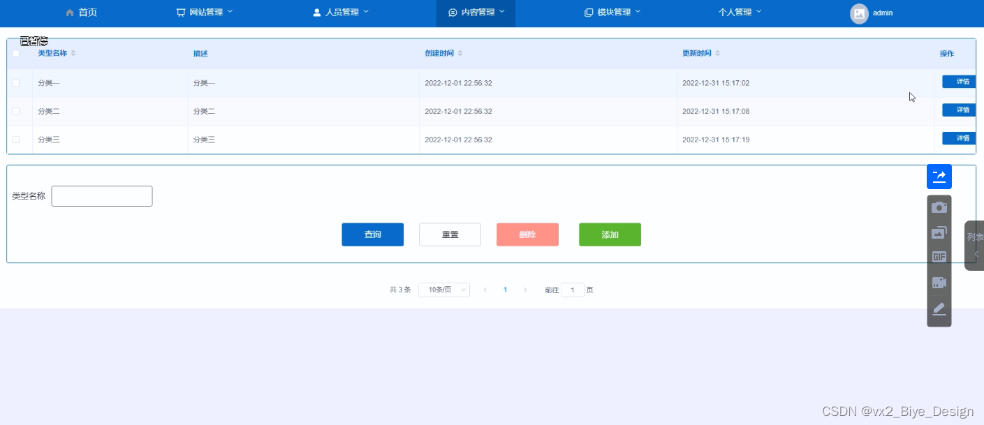 (2)网站管理:当点击“网站管理”这一菜单的时候,会出现轮播图+公告信息两个子菜单,可以对这两个模块进行增删改查操作;