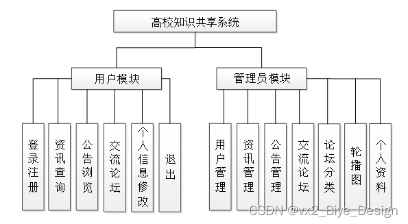 (3)确定好系统使用的技术,进行在线确认系统所划分的用户触,并且根据用户触划分确定所要设计的功能模块,对高校知识共享系统的设计主要划分别为管理员和用户触,并所使用的功能模块也相应不同,但系统的数据库实现的内容是交互的,驴可以随时根据自己的需求进行信息搜索,对于系统工作人员可以根据自己的分管内容进行在线信息的处理及操作,管理员获取到所有用户的详细数据信息,并根据需求进行第一时间处理解决。