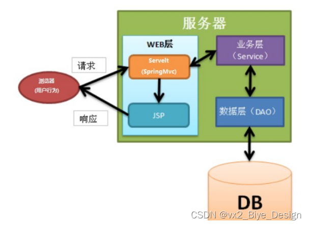 页面发送请求给控制器,控制器调用业务层处理逻辑,逻辑层向持久层发送请求,持久层与数据库交互,后将结果返回给业务层,业务层将处理逻辑发送给控制器,控制器再调用视图展现数据。
