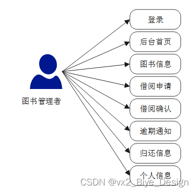 图书管理者:后台首页、模块管理(图书信息、借阅申请、借阅确认、逾期通知、归还信息)