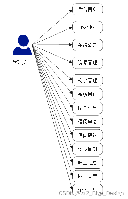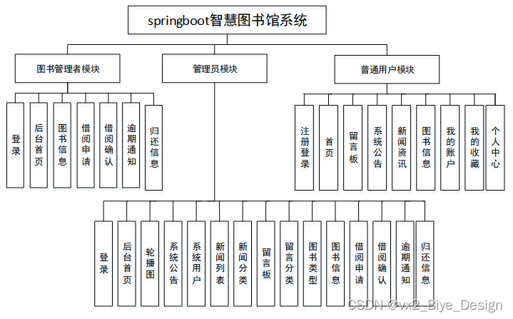 管理员模块:后台首页、轮播图、系统公告管理、资源管理(新闻列表、新闻分类)、交流管理(留言板、留言分类)、系统用户管理(管理员、图书管理者、普通用户)、模块管理(图书类型、图书信息、借阅申请、借阅确认、逾期通知、归还信息)。