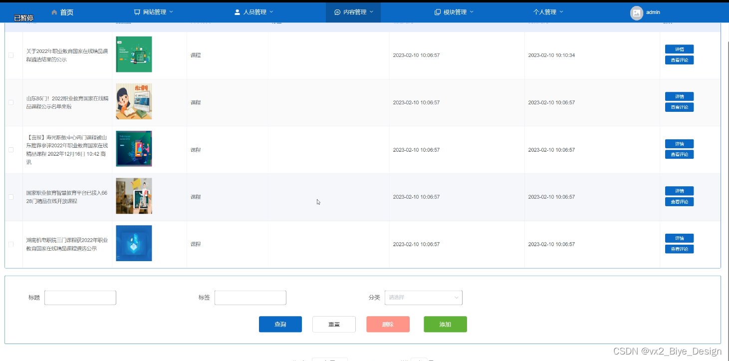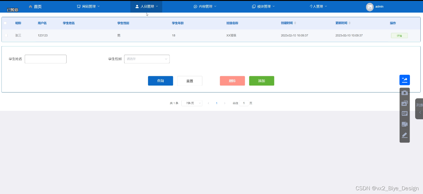 (3)人员管理:当点击“人员管理”这一菜单的时候,会出现管理员+学生用户+教师用户三个子菜单,可以对这三个模块进行增删改查操作;