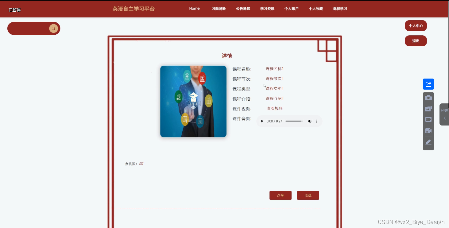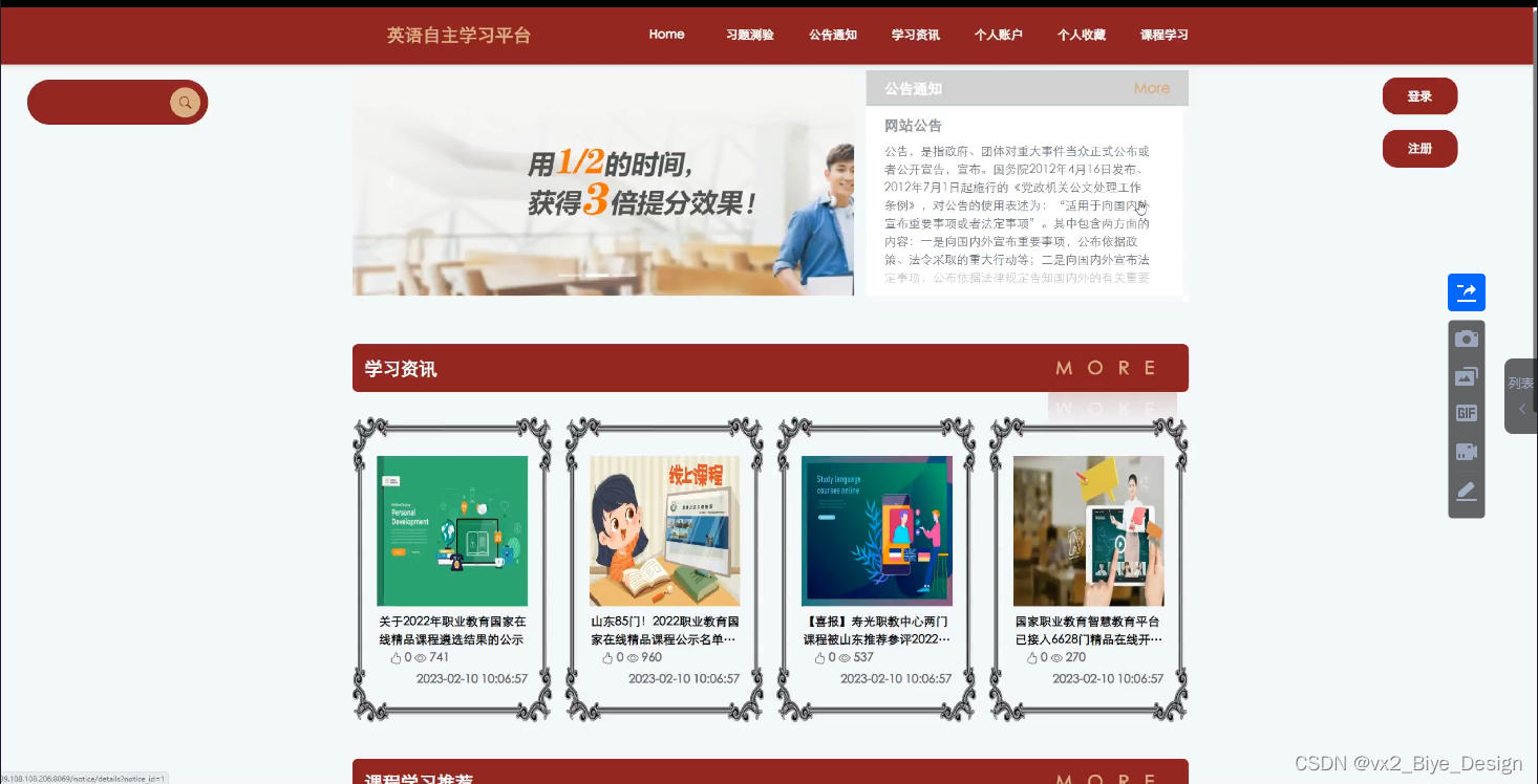 本设计主要实现集人性化、高效率、便捷等优点于一身的英语自主学习平台,实现功能:首页、网站管理(轮播图、公告通知)人员管理(管理员、学生用户、教师用户)内容管理(学习资讯、资讯分类、习题测验)模块管理(课程类型、课程学习)个人管理(个人信息、密码修改)等功能模块。系统通过浏览器与服务器进行通信,实现数据的交互与变更。只需通过一台电脑,动动手指就可以操作系统,实现数据通信管理。整个系统的设计过程都充分考虑了数据的安全、稳定及可靠等问题,而且操作过程简单。本系统通过科学的管理方式、便捷的服务提高了工作效率,减少了数据存储上的错误和遗漏。