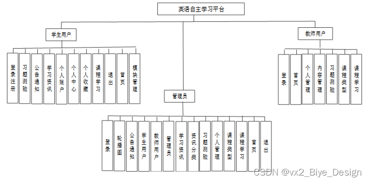 英语自主学习平台从角色上划分为了学生用户、教师用户以及管理员三种角色。