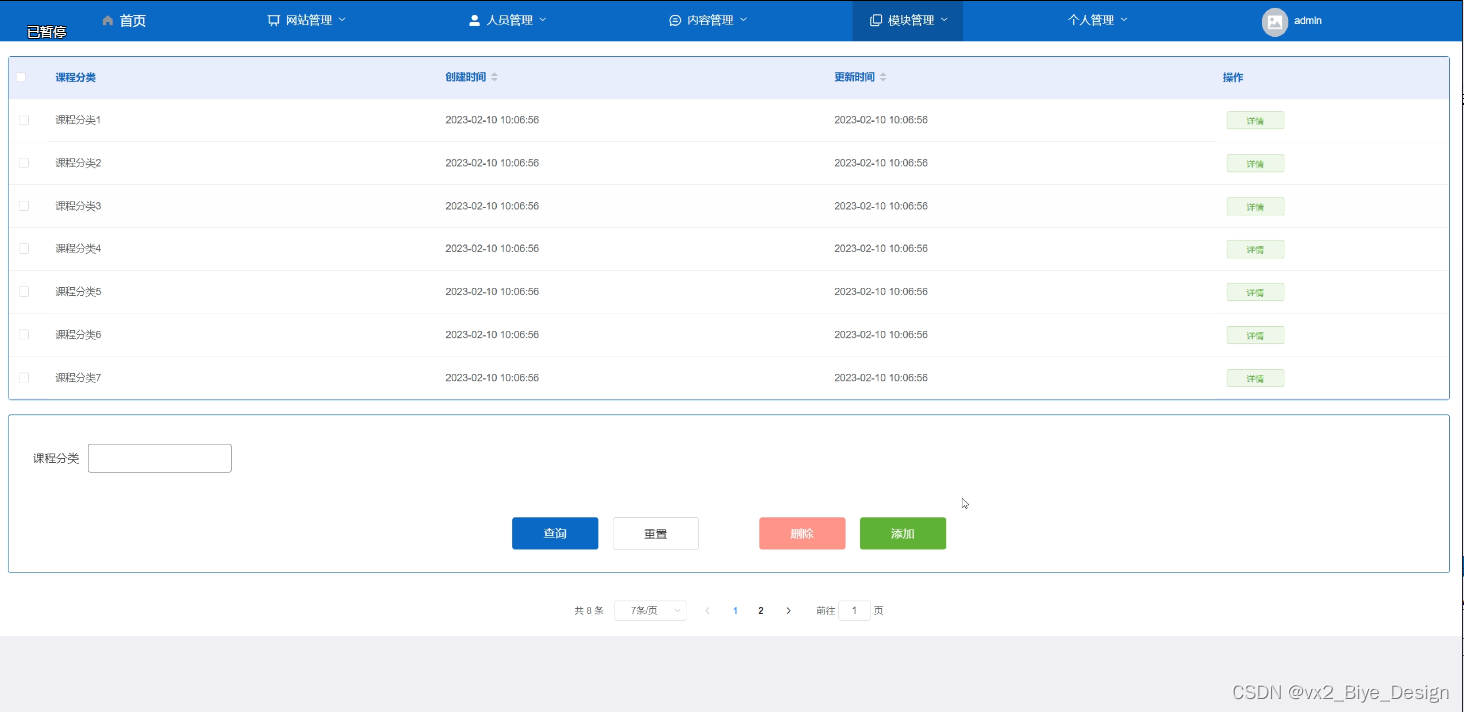 (4)模块管理:当点击“模块”这一菜单的时候,会出现课程类型+课程学习这两个子菜单,管理员能够对两个模块进行增删改查操作;