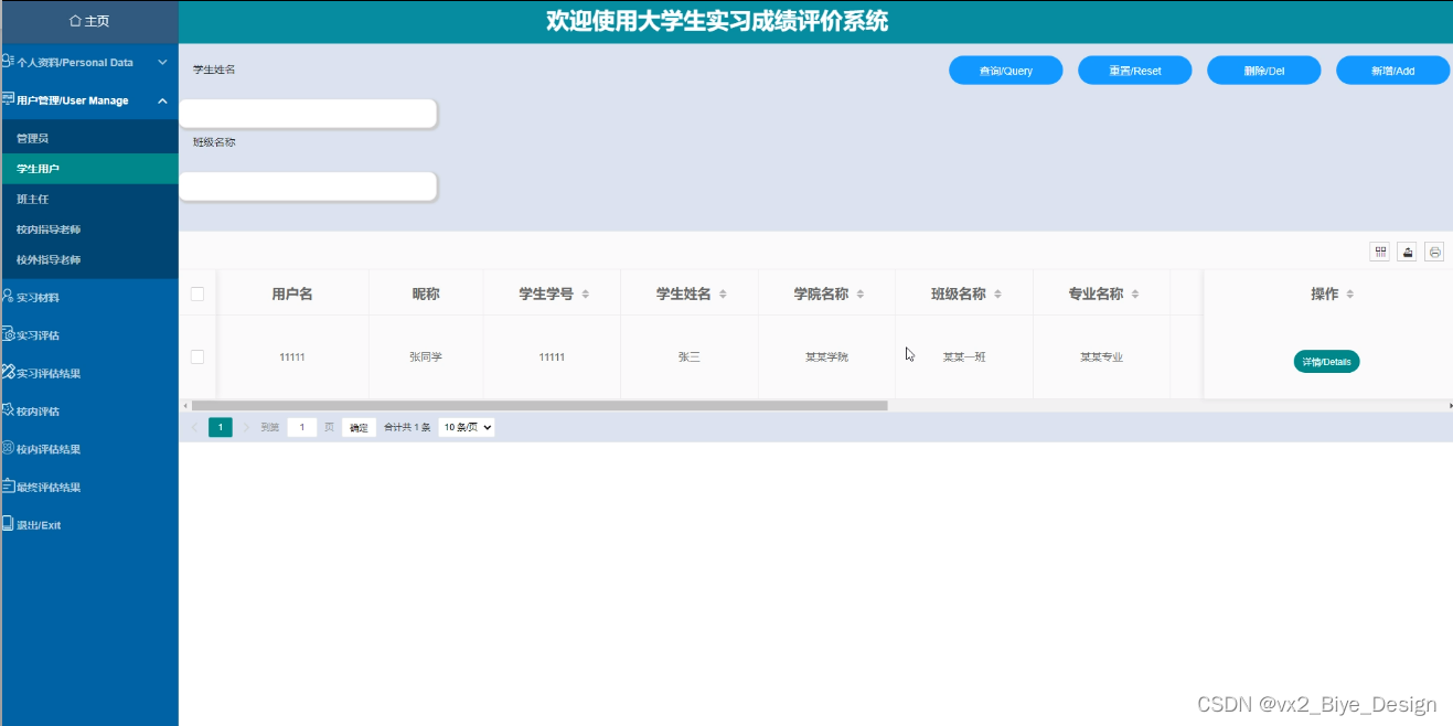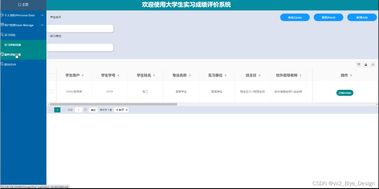 最终评估结果管理,在最终评估结果管理页面中可以查看索引、学生用户、学生学号、学生姓名、学院名称、班级名称、专业名称、实习单位等信息,并可根据需要进行修改或删除等详细操作,如图5-4所示。