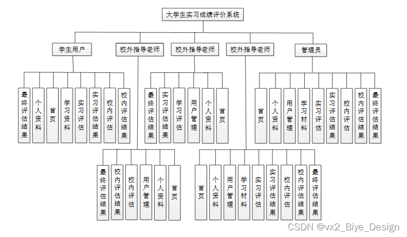 系统架构图属于系统设计阶段,系统架构图只是这个阶段一个产物,系统的总体架构决定了整个系统的模式,是系统的基础。大学生实习成绩评价系统的整体结构设计如图4-2所示。