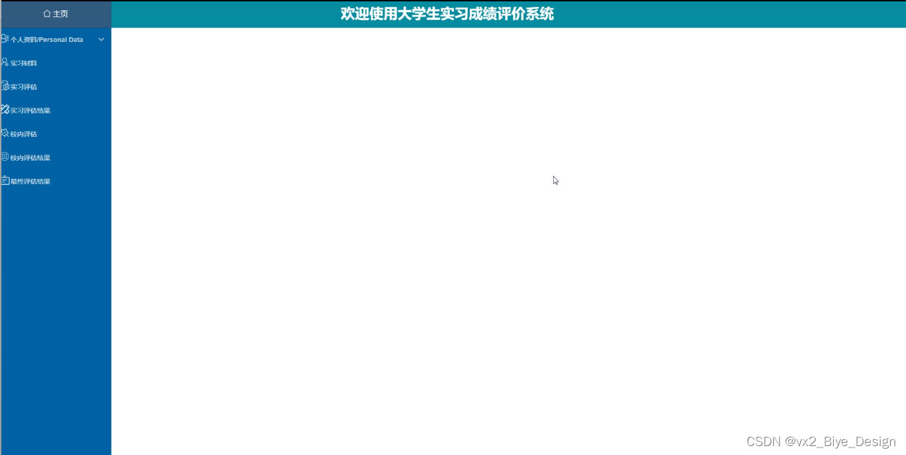 学生登录进入大学生实习成绩评价系统可以查看首页、个人资料(个人信息,修改密码)、学习材料、实习评估、实习评估结果、校内评估、校内评估结果、最终评估结果等,如图5-6所示。