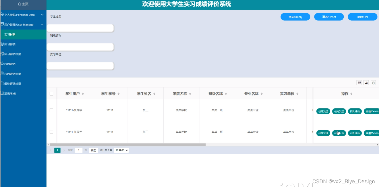 评估结果管理,在评估结果管理页面中可以查看索引、学生用户、学生学号、学生姓名、学院名称、班级名称、专业名称、实习单位、班主任、校外指导老师等信息,并可根据需要进行修改或删除等详细操作,如图5-12所示。