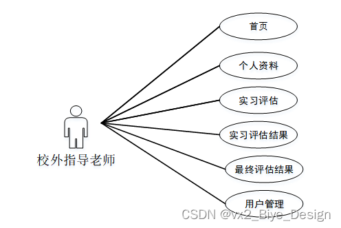 校外指导老师进入系统可以进行首页、人资料(个人信息,修改密码)、用户管理、实习评估、实习评估结果、最终评估结果管理等。校外指导老师用例如图3-11所示。