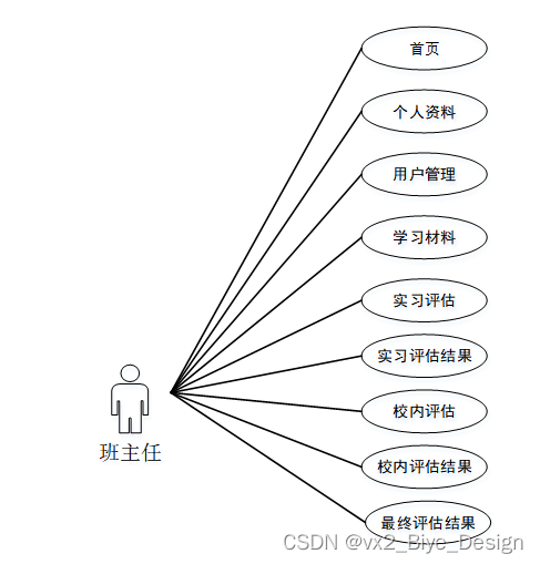 班主任进入系统可以进行首页、人资料(个人信息,修改密码)、用户管理(学生用户)、学习材料、实习评估、实习评估结果、校内评估、校内评估结果、最终评估结果管理等。班主任用例如图3-9所示。