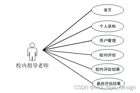 校内指导老师进入系统可以进行首页、人资料(个人信息,修改密码)、用户管理、校内评估、校内评估结果、最终评估结果管理等。校内指导老师用例如图3-10所示。