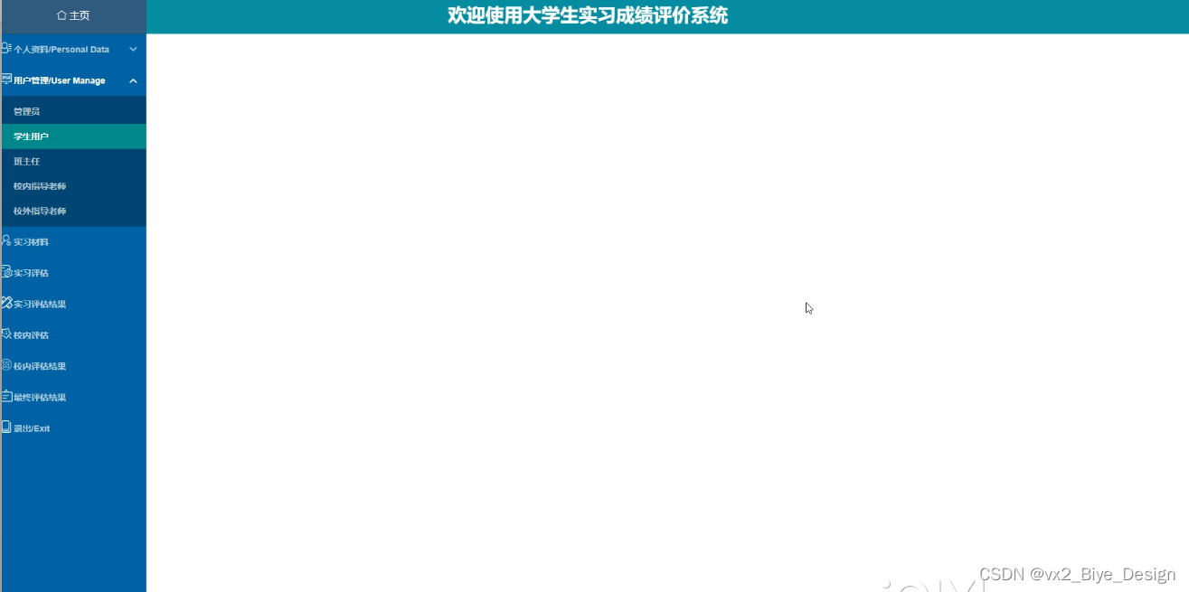 管理员登录进入大学生实习成绩评价系统可以查看首页、个人资料(个人信息,修改密码)、用户管理(管理员、学生用户、班主任、校内指导老师、校外指导老师)、学习材料、实习评估、实习评估结果、校内评估、校内评估结果、最终评估结果信息,如图5-2所示。