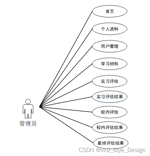 系统中的核心用户是系统管理员,管理员登录后,通过管理员菜单来管理后台系统。主要功能有:首页、个人资料(个人信息,修改密码)、用户管理(管理员、学生用户、班主任、校内指导老师、校外指导老师)、学习材料、实习评估、实习评估结果、校内评估、校内评估结果、最终评估结果功能。管理员用例如图3-7所示。