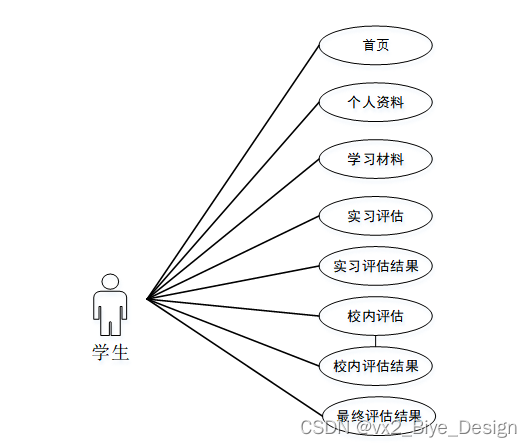 学生进入系统可以进行首页、个人资料(个人信息,修改密码)、学习材料、实习评估、实习评估结果、校内评估、校内评估结果、最终评估结果管理等。学生用例如图3-8所示。