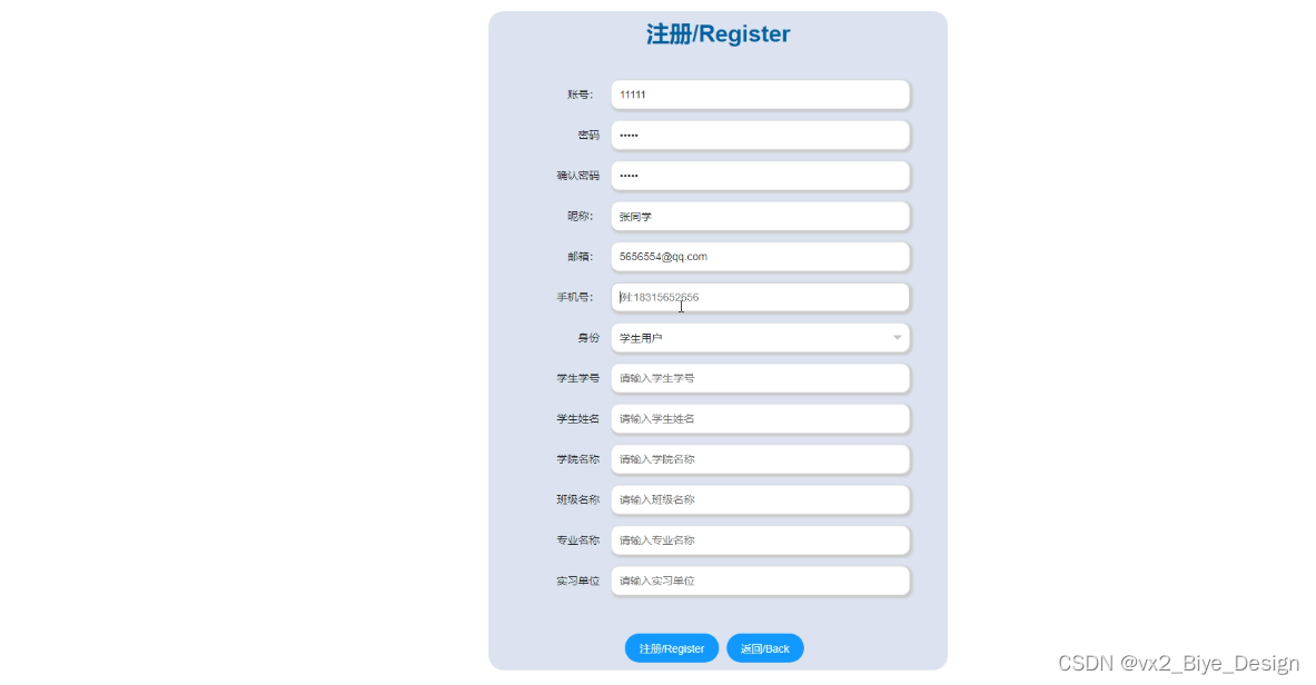 学生注册,在注册页面可以填写:账户、设置密码、确认密码、昵称、邮箱、手机号、身份等信息,进行注册,图5-5。