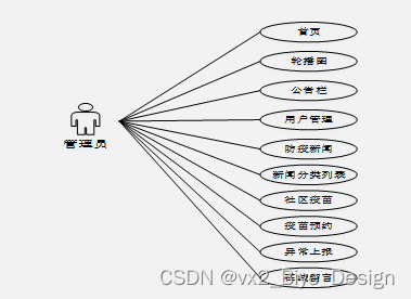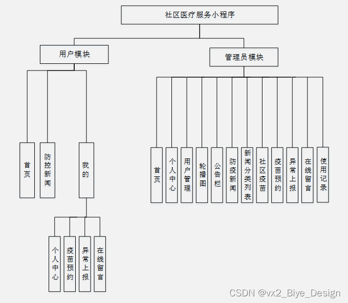 基于社区医疗服务小程序管理系统基于现有的手机,可以实现管理员:首页、轮播图、公告栏、资源管理(防疫新闻、新闻分类列表)系统用户(管理员、系统用户)模块管理(社区疫苗、疫苗预约、异常上报、在线留言)等详细的了解及统计分析。根据系统功能需求建立的模块关系图如下图: