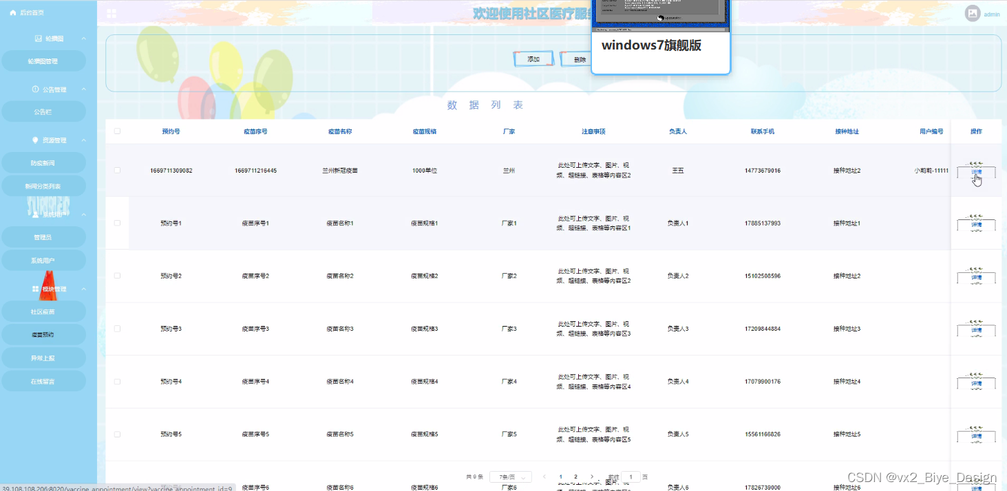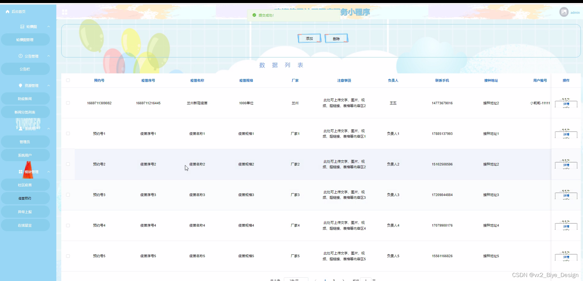 社区疫苗,在社区疫苗页面可以查看疫苗编号、疫苗名称、封面、疫苗数量、疫苗规格、厂家、注意事项、负责人、联系手机等内容,并可根据需要进行修改或删除操作,如图5-11所示。