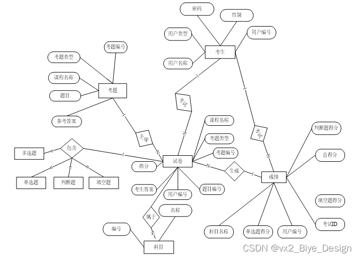试卷:存储用户的试卷信息。包括试卷的试卷编号、课程名称、单选题、判断题、填空题、开始日期、结束日期等数据项。