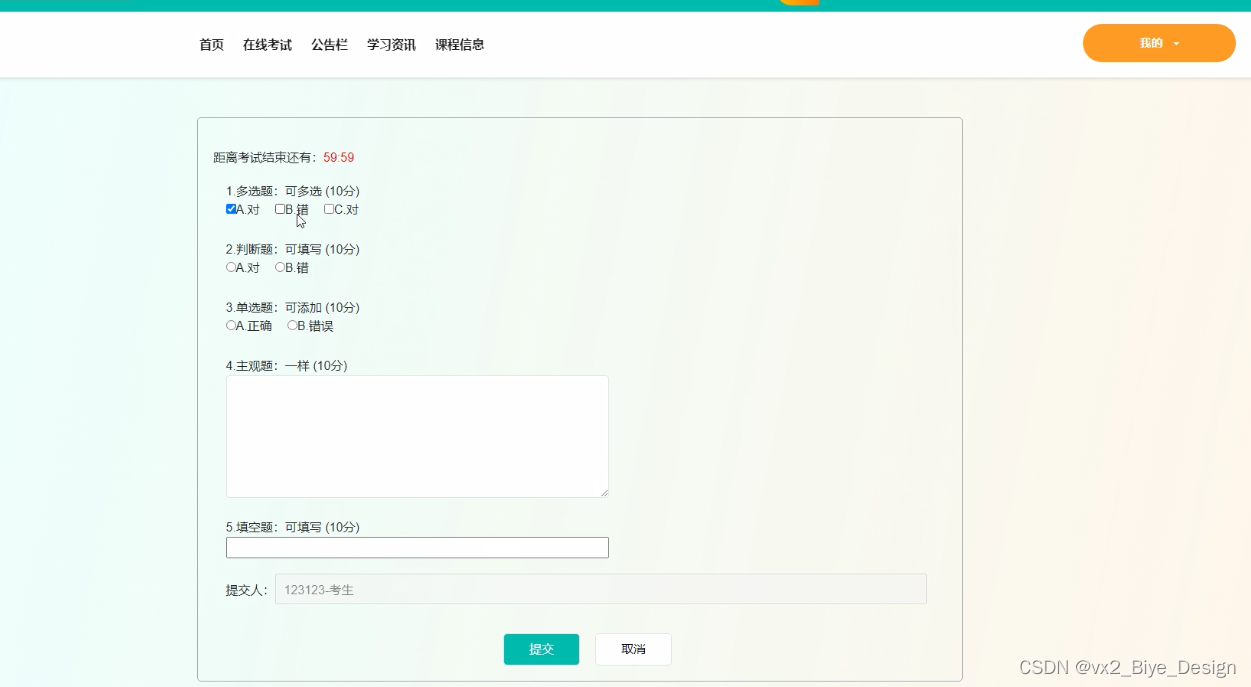系统能自动给考生选题,考题必须是随机分配的,以保证考试的公平性。考生在考试过程中页面将提供考试时间倒计时功能,使考生随时了解考试剩余时间。在考试时间到时,系统将自动地将考生考试试卷提交,将提醒考生离开考场。当考试试卷提交时,系统自动为选择题、判断题、填空等客观题评分。