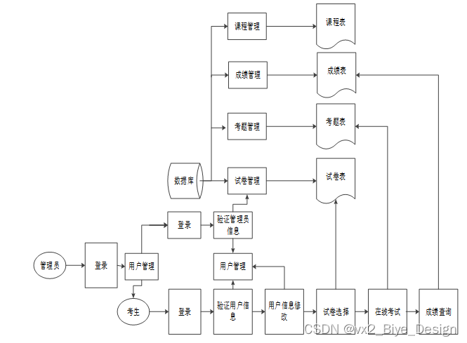 试卷管理模块:试卷管理分为试卷添加、修改和在线考试。试卷信息由管理员进行修改、添加、删除操作;在线考试由学生来执行。