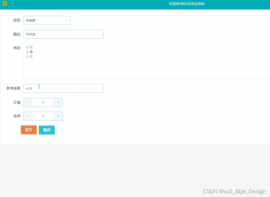 此页面的关键是编写试题信息,单击提交按钮以完成信息的添加。如果未写入完整的试题信息,例如,如果未写入试题编号,系统将给出相应的错误提示,并且无法成功输入。数据以概念的形式以onsubmit =“return checkForm()”的形式写入以进行检查,checkForm()函数是一种用于写入数据的不同类型的校对方法,是不是为空也是经过form表单中的onsubmit=”return checkForm()来检查。