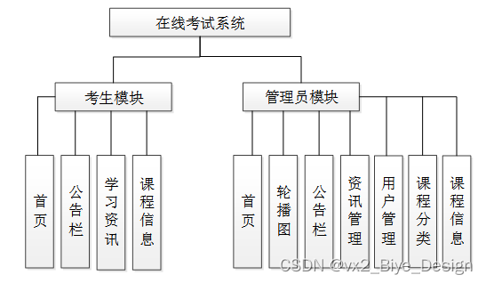 在线考试系统总体分为前台用户模块和后台管理员模块。