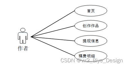 作者用户进入系统可以进行首页、模块管理(创作作品、提现信息、稿费明细)管理等。用户用例如图3-8所示。