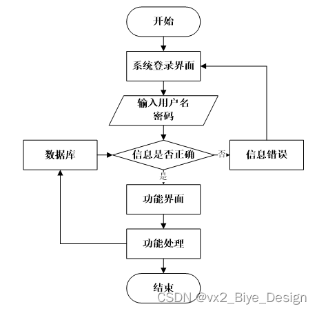 用户打开并进入系统后,会先显示登录界面,输入正确的用户名和密码,系统自动检测信息,若信息无误,则用户会进入系统功能界面,进行操作,否则会提示错误无法登录,操作流程如图3-3所示。